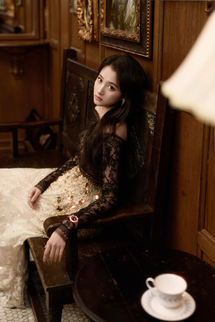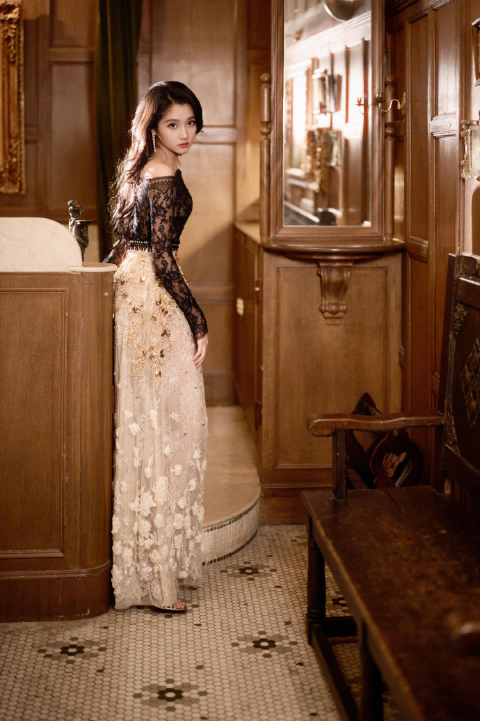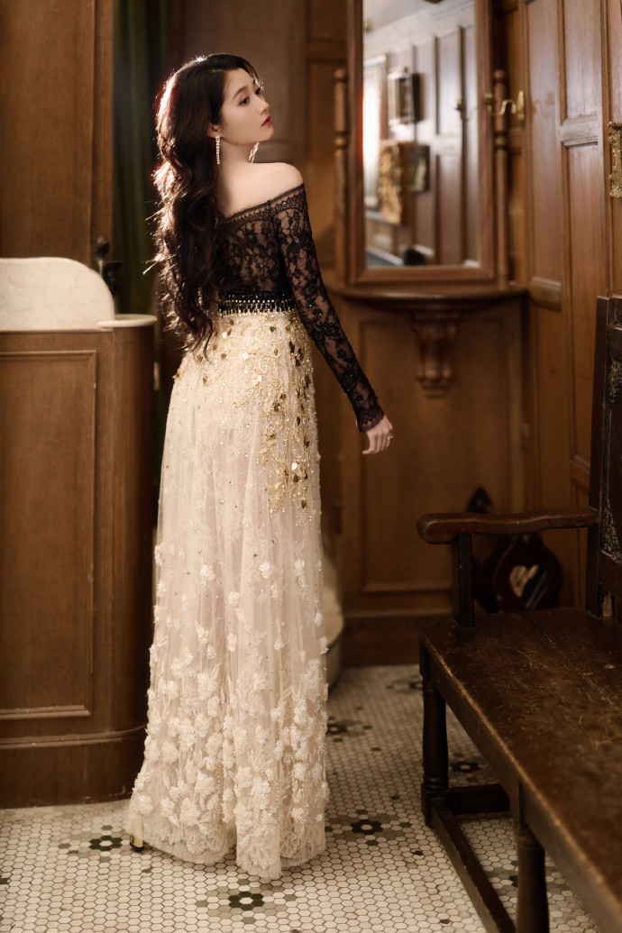 上身的黑色蕾丝上衣,有着“含蓄的张扬”特点。一字肩和灯笼袖的设计,既保留了法式古典的骨架,又用蕾丝的镂空打破了厚重感——肌肤在蕾丝下若隐若现,是比直接裸露更高级的性感。下身的米白色亮片刺绣长裙,则是“行走的月光”:暖光下亮片如星屑流动,冷光下立体花朵又凸显浮雕般的质感。黑与米白的配色看似低调,却在肌理上玩出了戏剧张力。